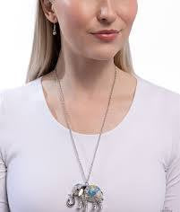 Featuring turquoise and Misted Marigold-painted ornate details and light sapphire iridescent rhinestones, a silver elephant complete with a white rhinestone-dusted body gracefully glides below the neckline from a classic silver chain for an elegantly enlightened display. Features an adjustable clasp closure. Due to its prismatic palette, color may vary.