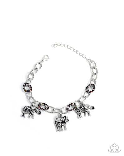 A chunky silver chain is adorned with ornately detailed elephant charms, each featuring embossed filigree motifs. Vibrant rhinestone-encrusted ovals link with the chain, adding a pop of color and sparkle to the design, enhancing its playful yet elegant aesthetic. Features an adjustable clasp closure.
